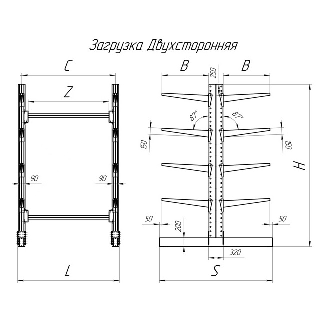 Стеллаж консольный островной металлический (C*S*H) 750*2100*1500 мм имеет 1 ярус с нагрузкой до 1500 кг на 2 консоли.